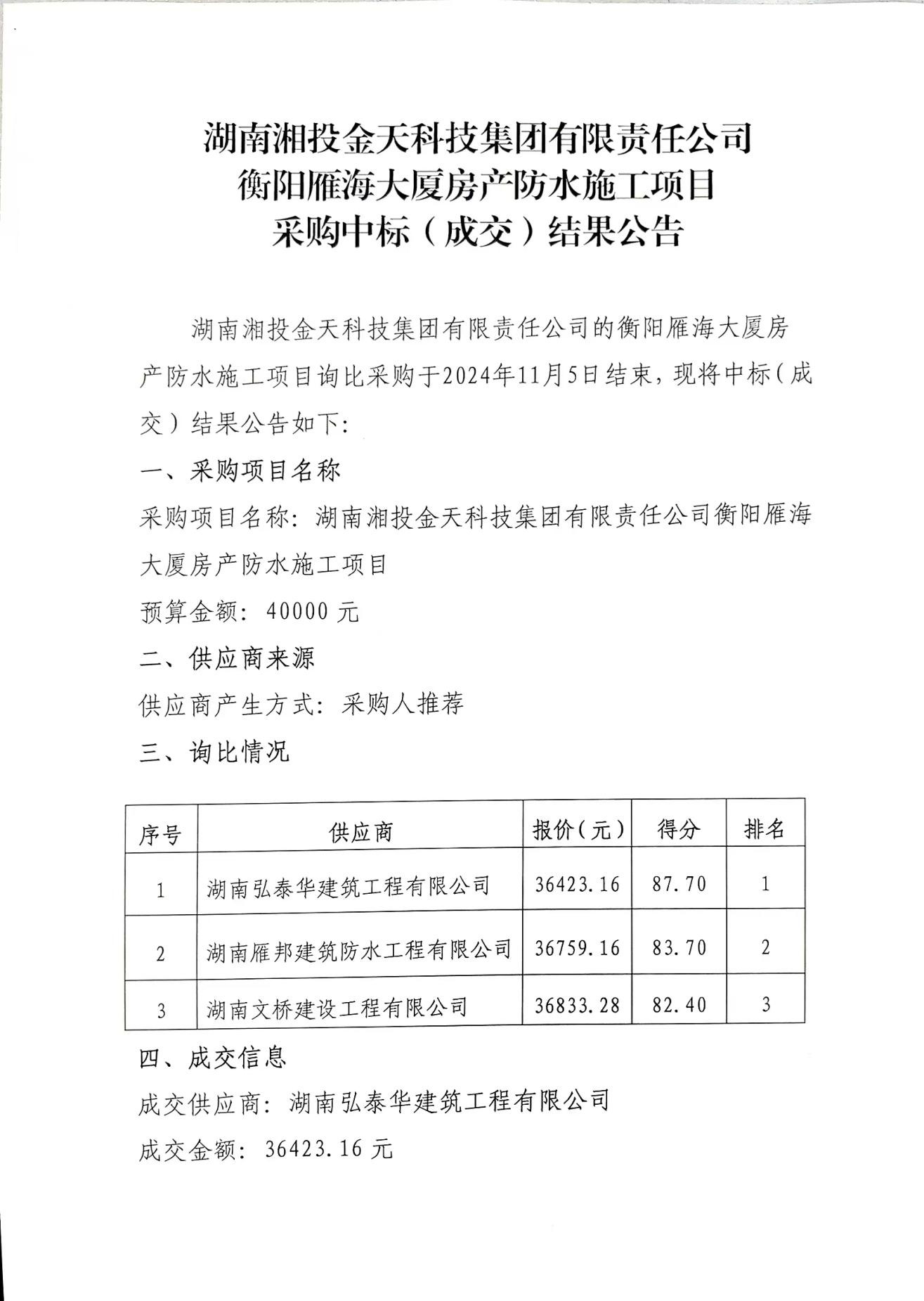 湖南湘投金天科技集团有限责任公司衡阳雁海大厦房产防水施工项目采购成交结果公告招采信息湖南能源集团有限公司-雷速体育官网